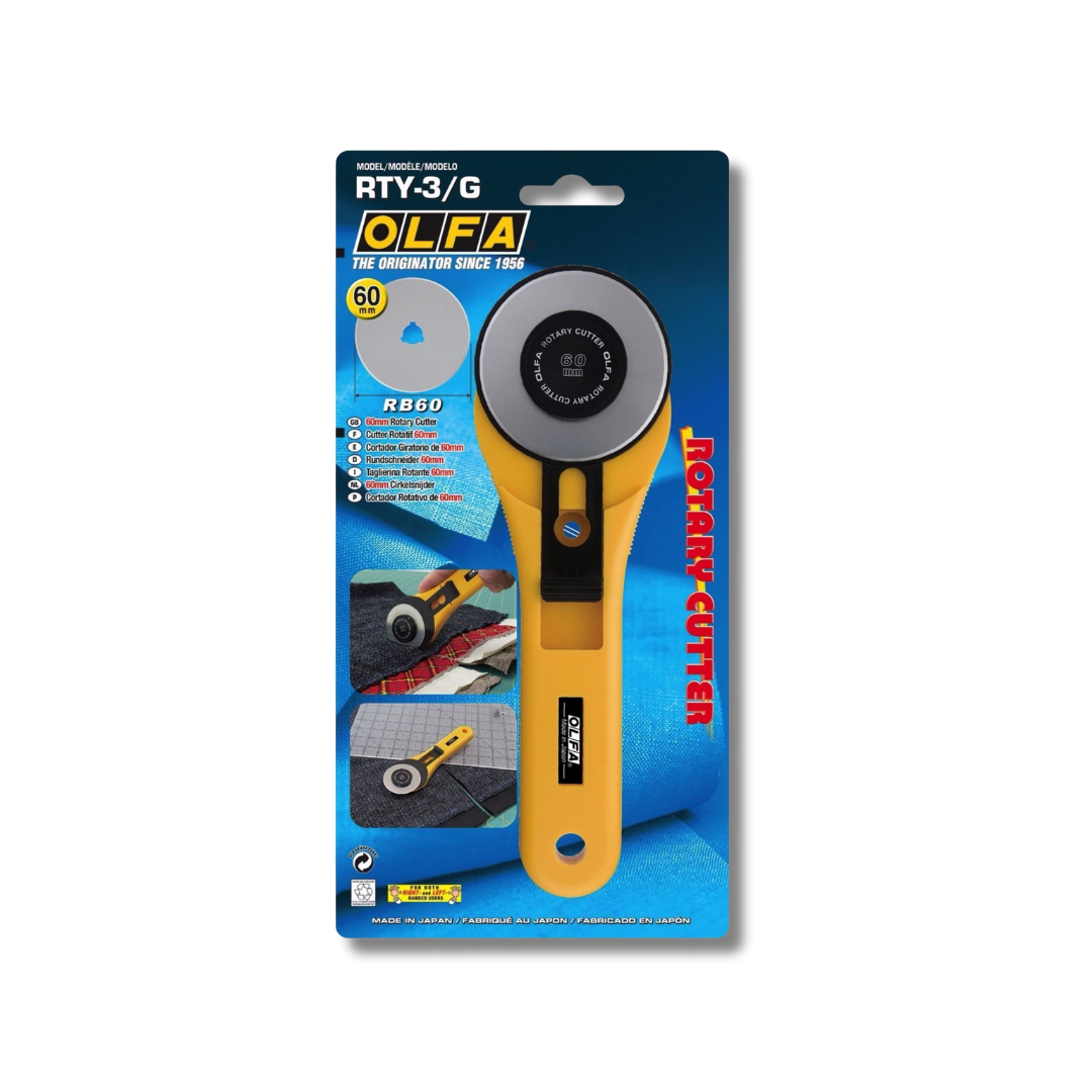 sa la taglierina rotante OLFA RTY-3/G con lama da 60 mm per tagliare fino a 12 strati di tessuto. Perfetta per quilting e patchwork, la lama in acciaio al tungsteno taglia facilmente cotone, lana, carta e pelle. Sicura da usare con un comodo coprilama. Scopri di più!